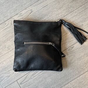 Vintage Roots black leather wristlet featuring a stylish tassel. Ideal for versatile use.