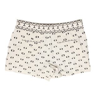 Beautiful Anthropologie boho shorts in a soft cream tone with intricate black geometric embroidery throughout. Designed with a detailed embroidered waistband and an easy, flattering fit.