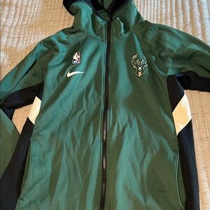 Green hoodie with Milwaukee Bucks logo. Features Nike swoosh and NBA patch. Full zip.
