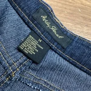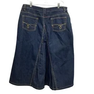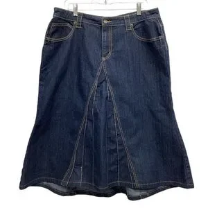 Nice flared style denim jean skirt is a dark wash with gold stitching. Front gore gives a flare to the style. Five pocket style. Like new condition. Denim is 55 Ramie/22% cotton/20% poly/3% spandex. Size 14 measures 29.5” length and 17” across the waist.
