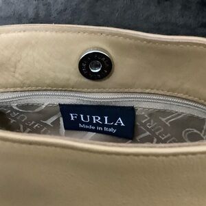 Chic Furla shoulder bag in tan leather. Features cream rope handles. Perfect for everyday style,