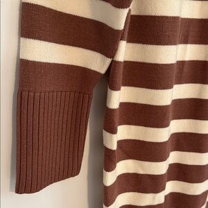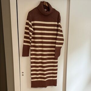 Stay cozy and stylish with this striped brown and cream turtleneck dress. Perfect for any occasion. Super cute with baby bump or without