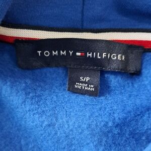 Bright blue sweatshirt with multicolored Tommy Hilfiger lettering.