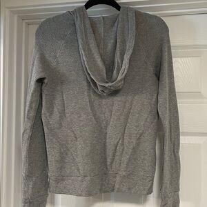 Comfortable gray sweater with scoop neck. Features a relaxed fit and drawstring detail. Ideal for layering.