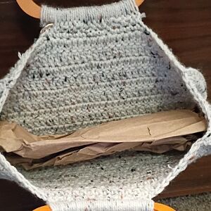 This elegant handcrafted mini bag features a stylish gray crochet design with a vibrant orange handle. Perfect for adding a touch of sophistication to any outfit.