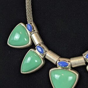 This necklace by Apt. 9 is made of a silver tone metal and has an adjustable lobster clasp closure. The necklace has a round metal mesh chain that has free-moving pieces at the front. The front pieces alternate between cylindrical beads with blue plastic ovals and larger green plastic triangles with open backs, and plain cylindrical "spacer" type beads. The necklace has normal wear, most visible as tone darkening in the metal, but is still very wearable and a lot of fun.