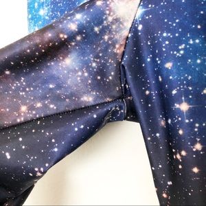 Stunning galaxy print leggings. Vibrant blue and black design. Perfect for a bold look.