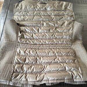 Chic metallic quilted vest. Features a sleek design with zip closure. Ideal for layering.