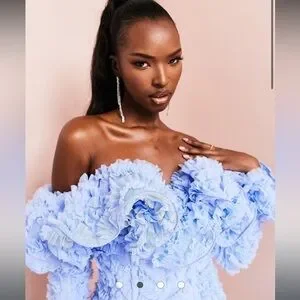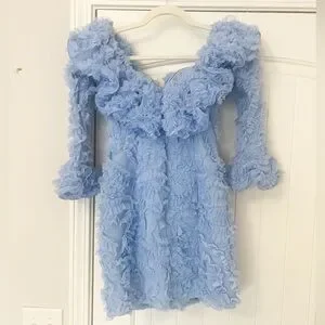 Step out in style with this elegant off-shoulder dress. Featuring a stunning ruffle design, this light blue dress is perfect for any occasion. Make a statement with its unique texture and flattering fit.