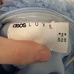 ASOS LUXE 3D Lace Ruffle Bardot Mini Dress in Blue