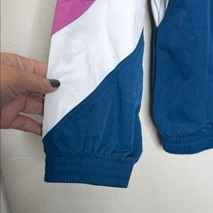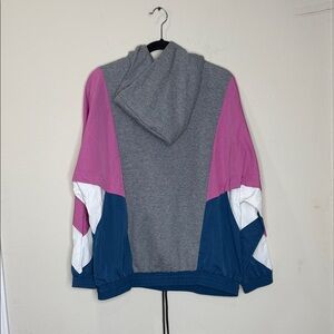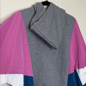 Vibrant Nike hoodie with pink, gray, blue, and white panels. Ideal for everyday style.