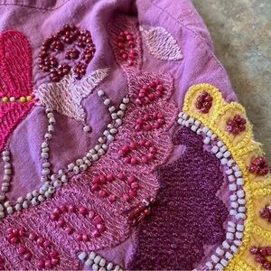 A flaw in fabric was repaired near bottom of zipper, cute little stitch fix there. Still solid and sturdy construction. Cozy modal lining. There may be a bead or few missing here or there, but only a couple tiny spots if any. as you can see in the video it looks brand new!