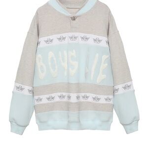 Chic Boys Lie hoodie. Soft gray and light blue tones. Perfect for casual wear.