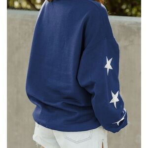 Stylish blue sweatshirt with 'Baseball Mom' print and bedazzled star details on sleeves. Brand new with tags. Size large.