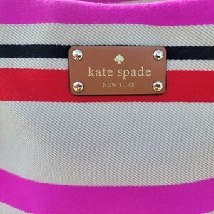 Excellent pre owned like new Kate Spade Stevie Oak Island striped tote. Canvas tote featuring eye catching colorful stripes and gorgeous leather trim. Almost in perfect condition, two very, very small marks on canvas( pictured)