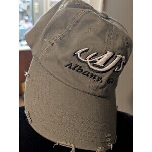 This is a stylish, "worn-in" look dad hat in a versatile Taupe (earth-tone brownish-gray). It features high-quality embroidery for AJ's, a local favorite in Albany, Georgia. The hat features factory-distressed detailing on the bill and crown for a rugged, vintage aesthetic.