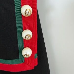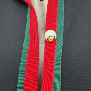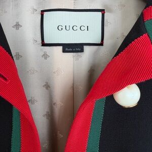 Gucci Chic black cost with bold red and green trim. Long sleeves and button-down front. Perfect for stylish occasions.