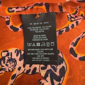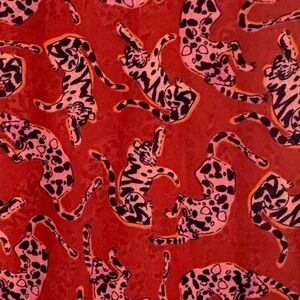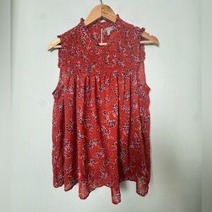 Sleeveless, sheer, smocked blouse with ruffle mock neck by Maeve from Anthropologie. Big cat print - could be a tiger or leopard.