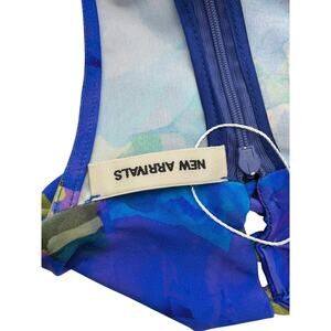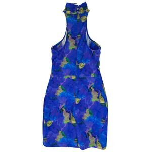 Sleeveless mini dress with a high halter neckline and racerback, finished with snap closure at the collar. Features a blue abstract floral print and a back zipper.
