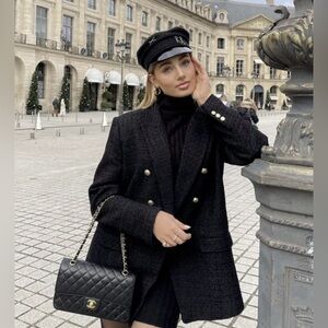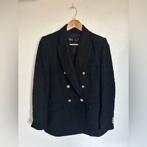 RARE Zara Black Textured Weave Tweed Double Breasted Gold Buttons Blazer Jacket