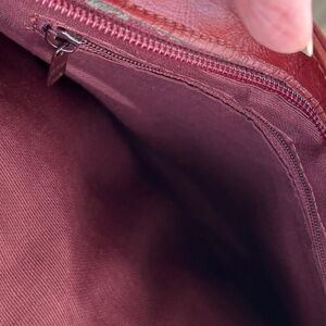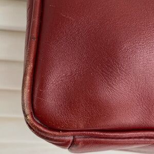 Vintage chestnut leather double-zip shoulder bag features roomy sections and an interior zip pocket. Lower corners show a little wear but the straps and body are in good condition, and the interior is immaculate. No makers label, made in Korea.