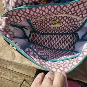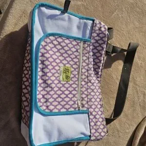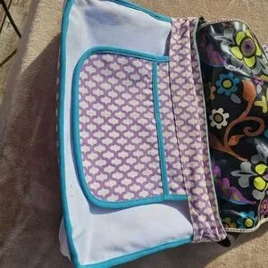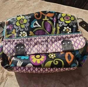 This vibrant messenger bag features a colorful floral design. Good used condition.