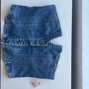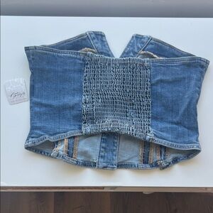 Stylish strapless denim top. Features button-down front. Perfect for casual outings.