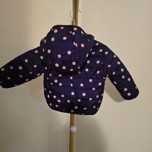 Carter's navy blue and pink polka dot puffer jacket for infants. It features a zip-front design with a pink zipper and a matching jersey or fleece lining in the hood and body.
