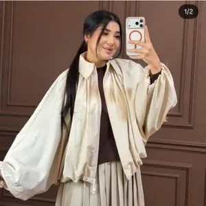 Bomber jacket made of lyocell yarn. Lapel collar and long puffed sleeves. Puffed hem with pleats. Front zip closure.