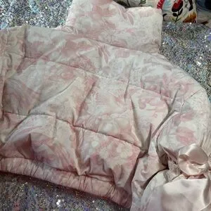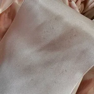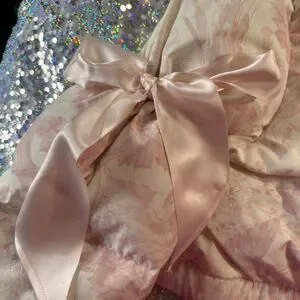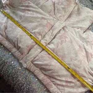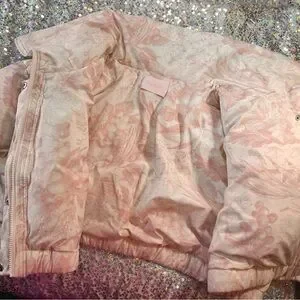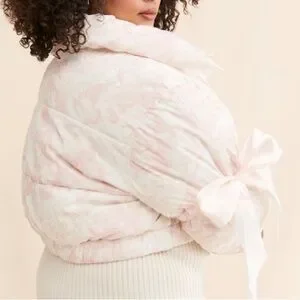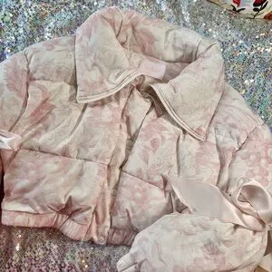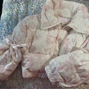 Look at this angelic piece! Baby pink and off white. Super luxurious feel, 2 big satin ribbons tied at the sleeves. Amazing used condition. Coat itself looks and feels brand new, some wearing on ribbons as shown. Very unnoticeable while wearing. Ribbons can be adjusted to tighten or loosen the sleeves. This piece truly speaks for itself.