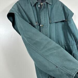 This vintage Carhartt coat is a stylish and functional piece for any occasion. The blue-green color and classic design make it a versatile addition to any wardrobe, while the durable cotton outer shell and polyester lining ensure warmth and comfort in all seasons. With a relaxed fit and mid-length jacket/coat length, this item is perfect for walking, casual wear, and workwear.