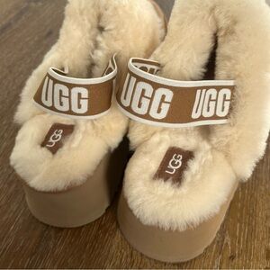 UGG Funkette platform slippers in the Chestnut color, featuring a suede upper, sheepskin collar, and an elastic UGG graphic backstrap. Women’s size 8. Excellent condition, only worn a few times .