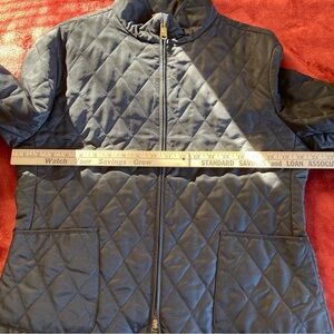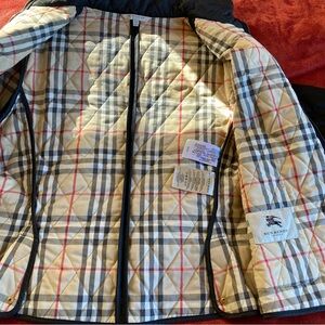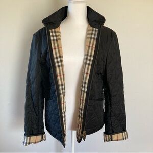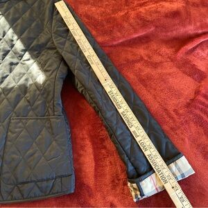 Elegant black quilted design. Features classic Burberry check cuffs. Ideal for warmth and style.