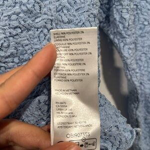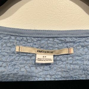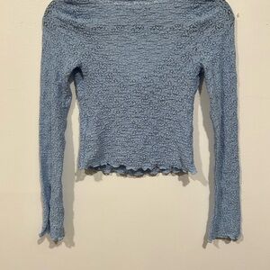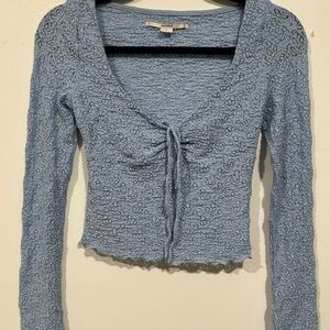 Chic light blue lace top with ruched front. Long sleeves and scoop neckline
