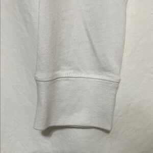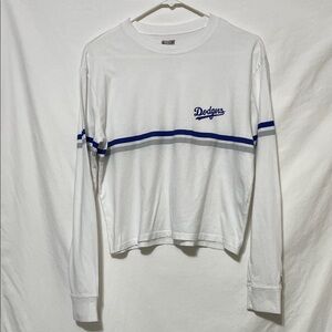 White long sleeve shirt with Dodgers logo and blue stripes.