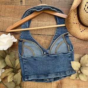 Denim Button-Up Halter Stretch Top Festival Rodeo Western Coastal Cowgirl