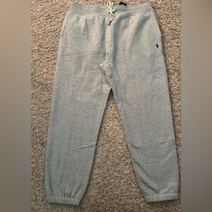 Classic Fleece Drawstring Gray Sweatpants with a navy blue signature embroidered pony logo. Bottom cuffs are ribbed.