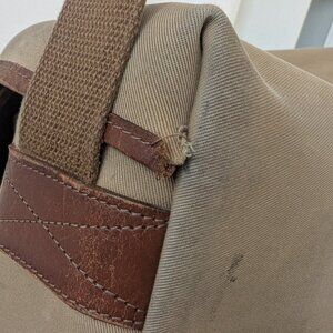 Classic Billingham Hadley Small camera bag in khaki canvas with leather trim. This bag is well worn and shows clear signs of use including scuffs, patina on the leather, and a small tear near the strap attachment (shown in photos). The tear has been present for years and has not grown or affected functionality. All closures, straps, padding, and internal dividers remain fully functional. Interior padding is intact and still provides good protection for a compact camera setup. A great option for someone who wants the legendary Billingham build quality without worrying about babying it.