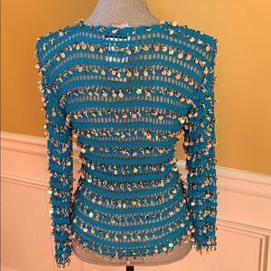 Beautiful knitted beaded shell is a bright turquoise blue. It has cutouts throughout. Completely see through. Can be worn as a sweater or as a coverup. Tiny beads all over with round iridescent sequins. Weighty. Underarm flat across is 14”. Length is 21”. Sleeve length is 21”. Some stretch in fabric. Valenti Brand