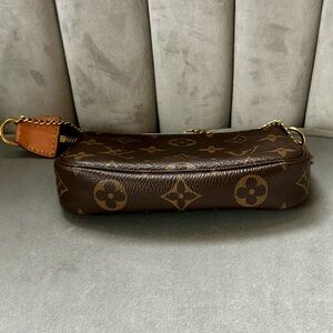Chic Louis Vuitton mini pochette with iconic monogram. Signs of use on the leather tab, zipper pull, and interior as shown in the photos. Good overall condition. Current retail is now $1,040 plus taxes. Comes with box, no dust bag.