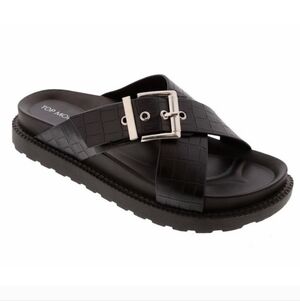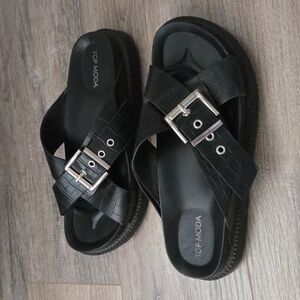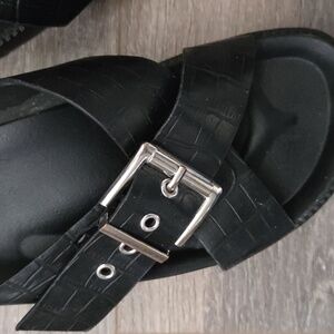 Sleek black sandals with croc-embossed straps. Features silver buckle accents. Ideal for casual wear.