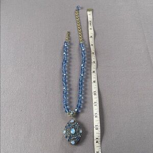 Dazzling necklace set with sapphire blue beads. Gold accents enhance the elegance. Perfect for any occasion. Necklace is a locket. One earring is missing a rhinestone (see pictures).