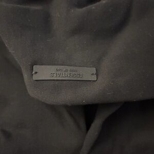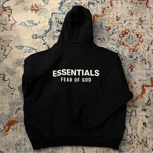 Classic black hoodie with bold Essentials logo. Comfortable and stylish for everyday wear.