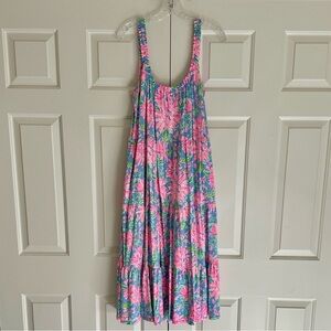 Beautiful printed tiered midi dress. Side pockets. EUC. Pit to pit is approximately 20โ. Shoulder to hem is approximately 48โ.