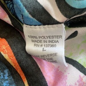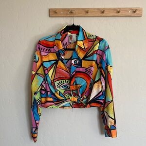 Vibrant button-up shirt with an abstract print. Features a mix of red, blue, yellow, and pink colors. Perfect for a bold fashion statement.