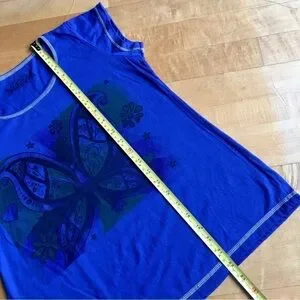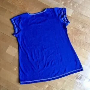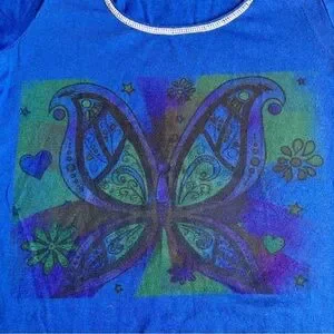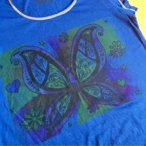 Beautiful, colorful, artistic butterfly graphic print tee! No brand, size, or materials tags but is supper soft (guessing mostly cotton blend) and measurements indicate a size XS. Vibrant royal blue background with greens, blacks. Nice choice for a change after work or leisure / sleep tee but would also look amazing paired with white shorts or capris for an unexpected style look! Would pick up on the white thread at the seams. ๐