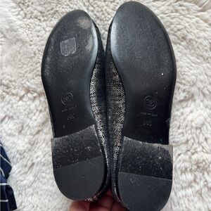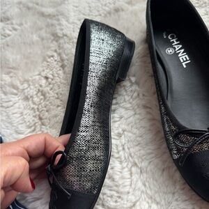 Flats are trendy now. Check retail price. These retail at 1200-1300 dollars!!! Stylish CHANEL flats with a black and silver design. Features a chic bow accent and iconic logo detail.