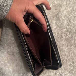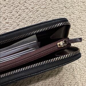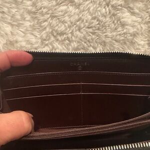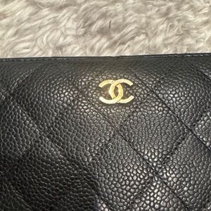 Sophisticated Chanel wallet with quilted design. Features iconic logo and sleek leather finish.