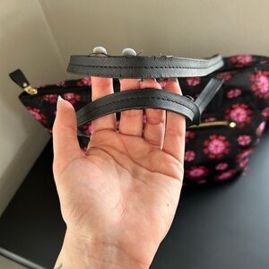 Elegant tote with vibrant pink flowers. Ideal for daily use. Some pealing and bending on handles shown in pictures. Clean inside, lots of storage! Works great for baby or travel bag!