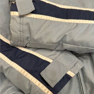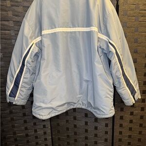Light blue jacket with navy accents. Features zip pockets and a high collar. Ideal for outdoor activities.